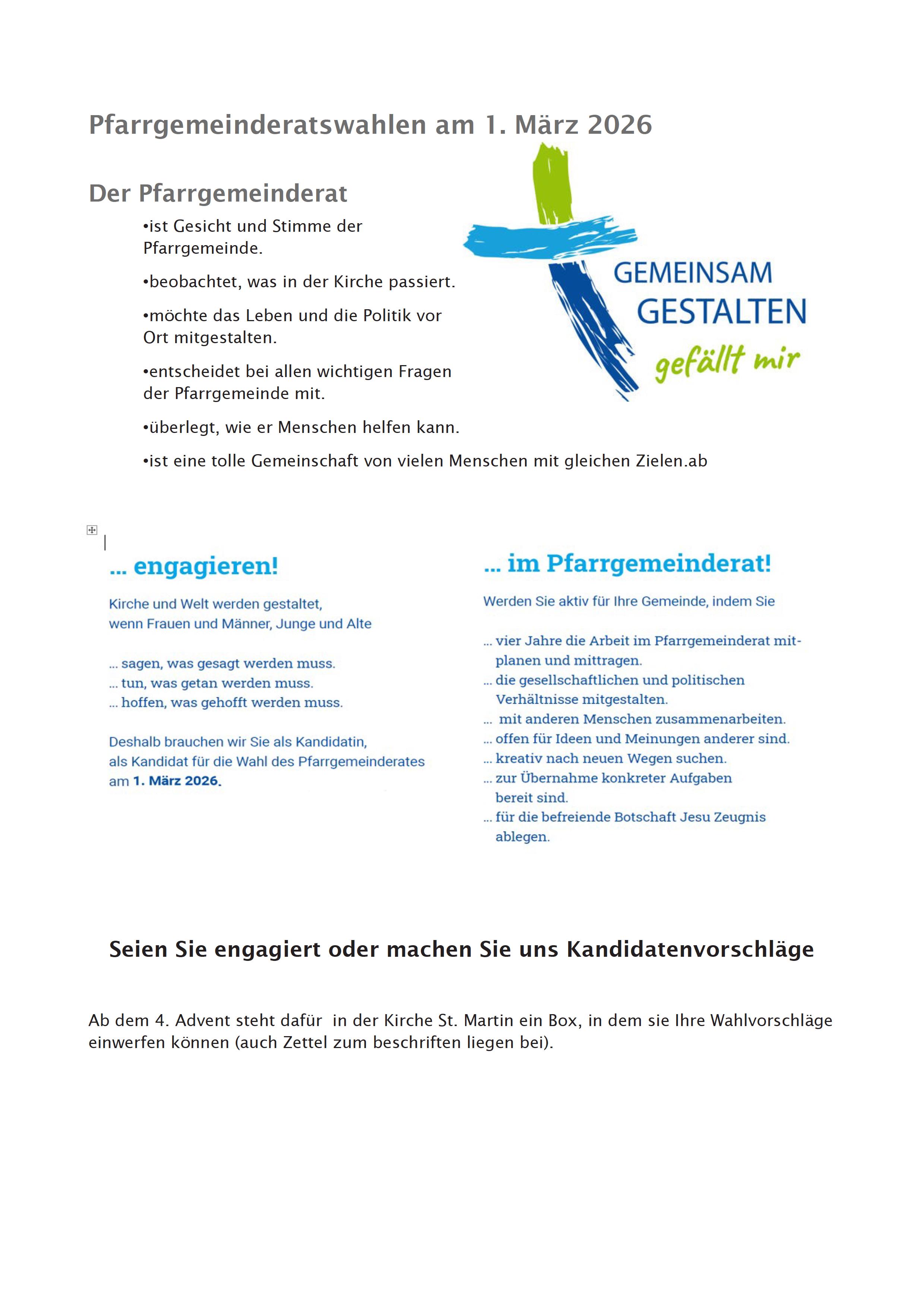 Wichtige Dokumente und Informationen zum Herunterladen (Bitte auswählen) Gottesdienstordnung Kategorie Suchbegriff 2025-11-27_15-23-29-flyer_anmeldung_sternsinger_2025.pdf Größe: 601.71 kB | Zuletzt geändert: 27.11.2025 Download 2025-12-01_09-45-50-flyer_anmeldung_sternsinger_2025.pdf Größe: 601.71 kB | Zuletzt geändert: 01.12.2025 Download 2025-12-12_10-22-58-plakat_amtsblatt_dez_2025_pgr_wahl_2026 Größe: 468.74 kB | Zuletzt geändert: 12.12.2025 Download Zusatz Größe: 142.70 kB | Zuletzt geändert: 19.12.2025 Download